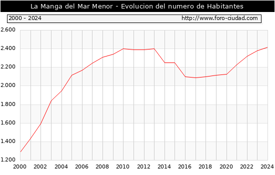 el numero de habitantes en La Manga del Mar Menor era de 2.416, 36 habitantes mas que el en el año 2023. En el grafico siguiente se puede ver cuantos habitantes tiene La Manga del Mar Menor a lo largo de los años.