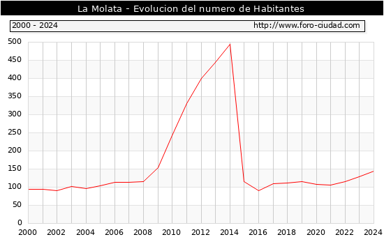 el numero de habitantes en La Molata era de 144, 16 habitantes mas que el en el año 2023. En el grafico siguiente se puede ver cuantos habitantes tiene La Molata a lo largo de los años.