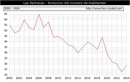 el numero de habitantes en Las Pachecas era de 19, 6 habitantes mas que el en el año 2023. En el grafico siguiente se puede ver cuantos habitantes tiene Las Pachecas a lo largo de los años.