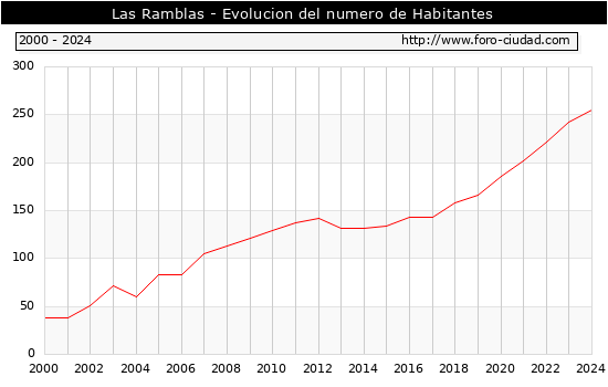 el numero de habitantes en Las Ramblas era de 255, 13 habitantes mas que el en el año 2023. En el grafico siguiente se puede ver cuantos habitantes tiene Las Ramblas a lo largo de los años.