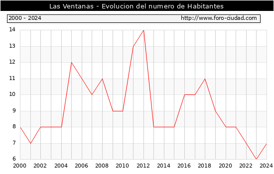 el numero de habitantes en Las Ventanas era de 7, 1 habitantes mas que el en el año 2023. En el grafico siguiente se puede ver cuantos habitantes tiene Las Ventanas a lo largo de los años.