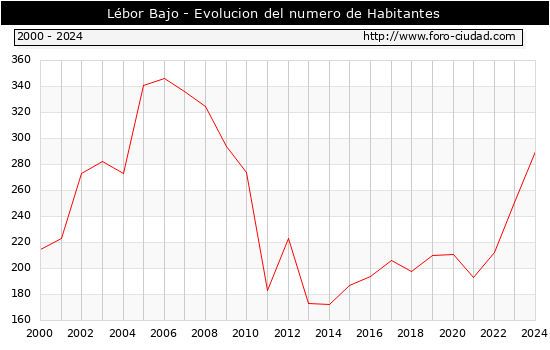 el numero de habitantes en Lébor Bajo era de 290, 39 habitantes mas que el en el ańo 2023. En el grafico siguiente se puede ver cuantos habitantes tiene Lébor Bajo a lo largo de los ańos.