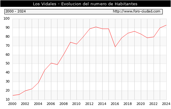 el numero de habitantes en Los Vidales era de 93, 3 habitantes mas que el en el año 2023. En el grafico siguiente se puede ver cuantos habitantes tiene Los Vidales a lo largo de los años.