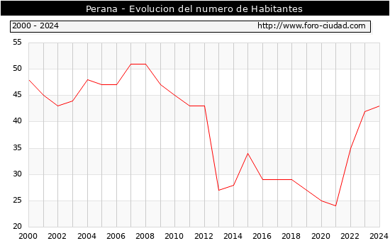 el numero de habitantes en Perana era de 43, 1 habitantes mas que el en el año 2023. En el grafico siguiente se puede ver cuantos habitantes tiene Perana a lo largo de los años.