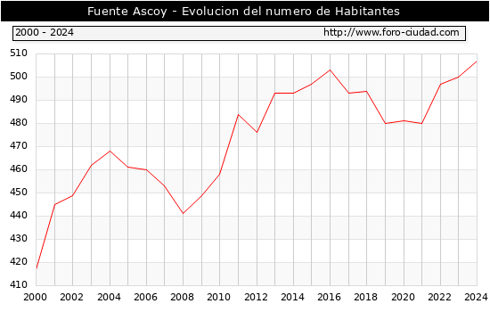 el numero de habitantes en Fuente Ascoy era de 507, 7 habitantes mas que el en el año 2023. En el grafico siguiente se puede ver cuantos habitantes tiene Fuente Ascoy a lo largo de los años.