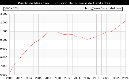 el numero de habitantes en Puerto de Mazarrón era de 12.240, 464 habitantes mas que el en el año 2023. En el grafico siguiente se puede ver cuantos habitantes tiene Puerto de Mazarrón a lo largo de los años.