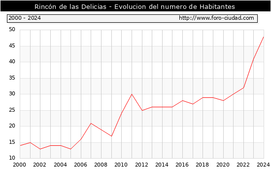 el numero de habitantes en Rincón de las Delicias era de 48, 7 habitantes mas que el en el año 2023. En el grafico siguiente se puede ver cuantos habitantes tiene Rincón de las Delicias a lo largo de los años.