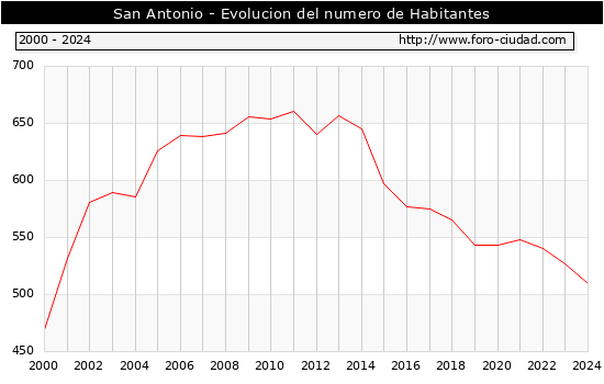 el numero de habitantes en San Antonio era de 510, 17 habitantes menos que el en el año 2023. En el grafico siguiente se puede ver cuantos habitantes tiene San Antonio a lo largo de los años.