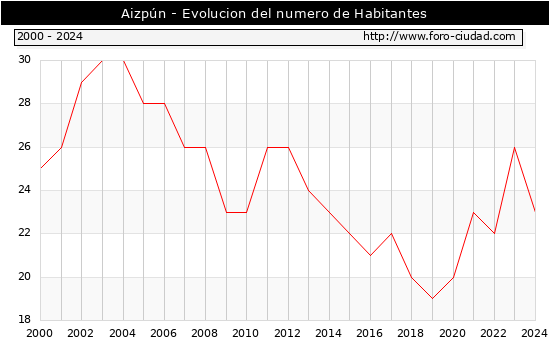 el numero de habitantes en Aizpún era de 23, 3 habitantes menos que el en el año 2023. En el grafico siguiente se puede ver cuantos habitantes tiene Aizpún a lo largo de los años.