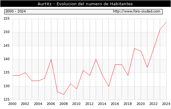 el numero de habitantes en Aurtitz era de 154, 3 habitantes mas que el en el año 2023. En el grafico siguiente se puede ver cuantos habitantes tiene Aurtitz a lo largo de los años.