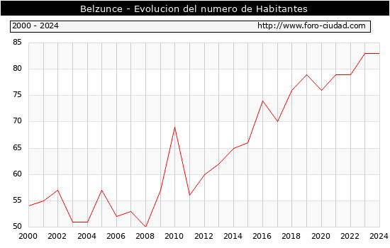 el numero de habitantes en Belzunce era de 83, igual numero de habitantes que el en el año 2023. En el grafico siguiente se puede ver cuantos habitantes tiene Belzunce a lo largo de los años.