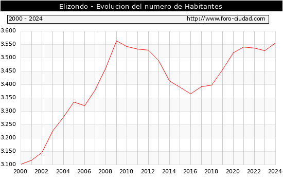 el numero de habitantes en Elizondo era de 3.556, 29 habitantes mas que el en el año 2023. En el grafico siguiente se puede ver cuantos habitantes tiene Elizondo a lo largo de los años.