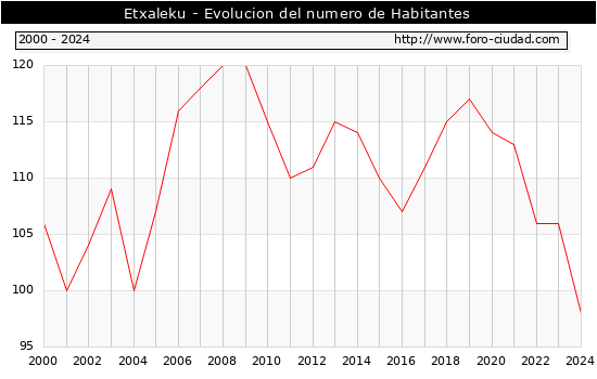 el numero de habitantes en Etxaleku era de 98, 8 habitantes menos que el en el año 2023. En el grafico siguiente se puede ver cuantos habitantes tiene Etxaleku a lo largo de los años.
