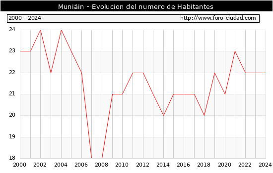 el numero de habitantes en Muniáin era de 22, igual numero de habitantes que el en el ańo 2023. En el grafico siguiente se puede ver cuantos habitantes tiene Muniáin a lo largo de los ańos.