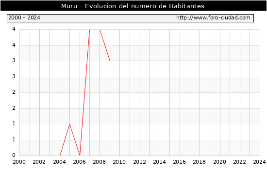 Segun los datos publicados por el INE a 1 de Enero de 2024 el numero de habitantes en Muru era de 3, igual numero de habitantes que el en el año 2023. En el grafico siguiente se puede ver cuantos habitantes tiene Muru a lo largo de los años.