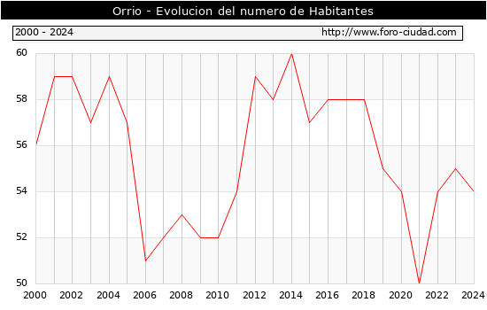 el numero de habitantes en Orrio era de 54, 1 habitantes menos que el en el año 2023. En el grafico siguiente se puede ver cuantos habitantes tiene Orrio a lo largo de los años.