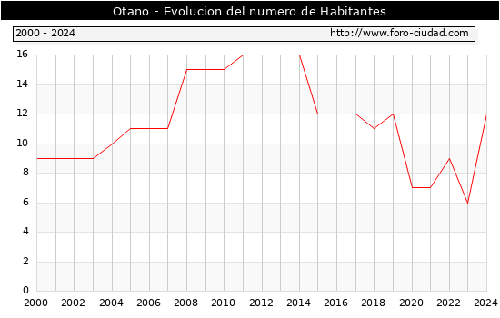 el numero de habitantes en Otano era de 12, 6 habitantes mas que el en el año 2023. En el grafico siguiente se puede ver cuantos habitantes tiene Otano a lo largo de los años.