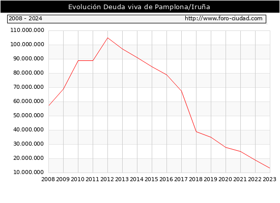 Pamplona/Iruña - Deuda viva del Ayuntamiento a 31/12/2024 Pamplona/Iruña - Deuda viva del Ayuntamiento a 31/12/2024 Segun el Ministerio de Economia y Hacienda el Ayuntamiento de Pamplona/Iruña a 31/12/2024 posee una deuda de 24.096.000 € . La deuda viva a 31/12/2023 ascendia a 13.369.000 € por lo que en el ultimo año la deuda crecio en 10.727.000 €. ![]()