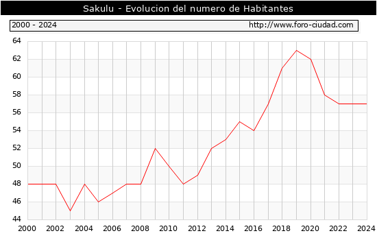 el numero de habitantes en Sakulu era de 57, igual numero de habitantes que el en el año 2023. En el grafico siguiente se puede ver cuantos habitantes tiene Sakulu a lo largo de los años.