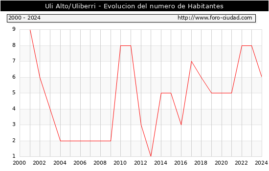 el numero de habitantes en Uli Alto/Uliberri era de 6, 2 habitantes menos que el en el año 2023. En el grafico siguiente se puede ver cuantos habitantes tiene Uli Alto/Uliberri a lo largo de los años.