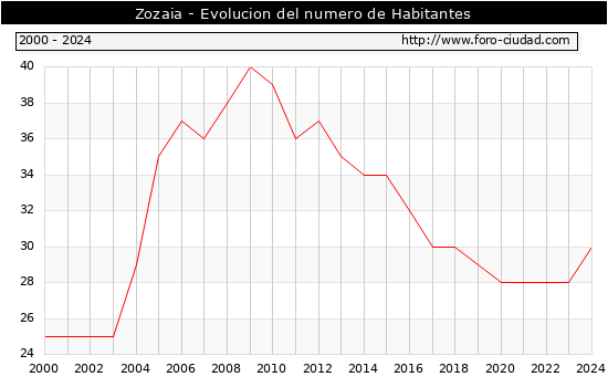 el numero de habitantes en Zozaia era de 30, 2 habitantes mas que el en el año 2023. En el grafico siguiente se puede ver cuantos habitantes tiene Zozaia a lo largo de los años.