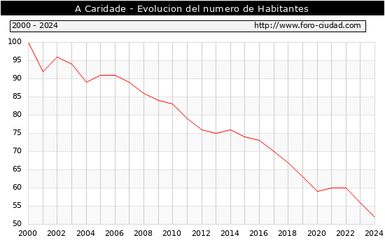 el numero de habitantes en A Caridade era de 52, 4 habitantes menos que el en el año 2023. En el grafico siguiente se puede ver cuantos habitantes tiene A Caridade a lo largo de los años.