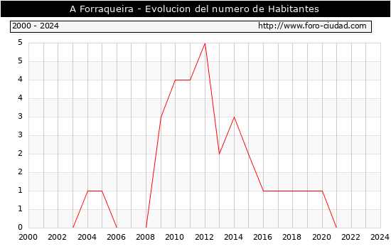 el numero de habitantes en A Forraqueira era de 0, igual numero de habitantes que el en el año 2023. En el grafico siguiente se puede ver cuantos habitantes tiene A Forraqueira a lo largo de los años.