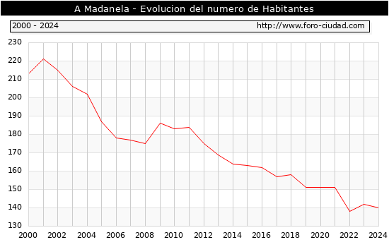 el numero de habitantes en A Madanela era de 140, 2 habitantes menos que el en el año 2023. En el grafico siguiente se puede ver cuantos habitantes tiene A Madanela a lo largo de los años.