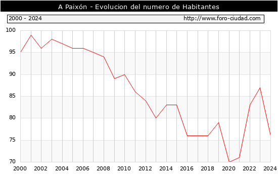 el numero de habitantes en A Paixón era de 76, 11 habitantes menos que el en el año 2023. En el grafico siguiente se puede ver cuantos habitantes tiene A Paixón a lo largo de los años.