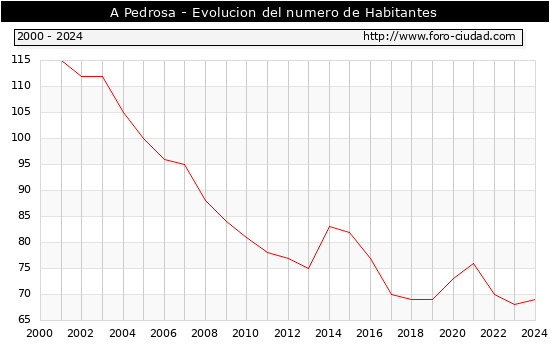 el numero de habitantes en A Pedrosa era de 69, 1 habitantes mas que el en el año 2023. En el grafico siguiente se puede ver cuantos habitantes tiene A Pedrosa a lo largo de los años.