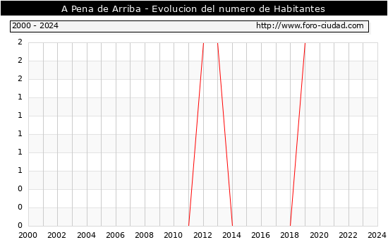 el numero de habitantes en A Pena de Arriba era de 2, igual numero de habitantes que el en el año 2023. En el grafico siguiente se puede ver cuantos habitantes tiene A Pena de Arriba a lo largo de los años.