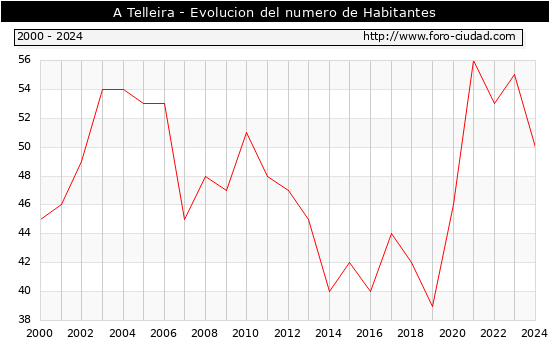 el numero de habitantes en A Telleira era de 50, 5 habitantes menos que el en el año 2023. En el grafico siguiente se puede ver cuantos habitantes tiene A Telleira a lo largo de los años.