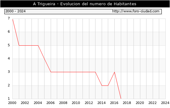 el numero de habitantes en A Trigueira era de 1, igual numero de habitantes que el en el año 2023. En el grafico siguiente se puede ver cuantos habitantes tiene A Trigueira a lo largo de los años.