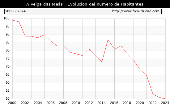 el numero de habitantes en A Veiga das Meás era de 50, 1 habitantes menos que el en el año 2023. En el grafico siguiente se puede ver cuantos habitantes tiene A Veiga das Meás a lo largo de los años.