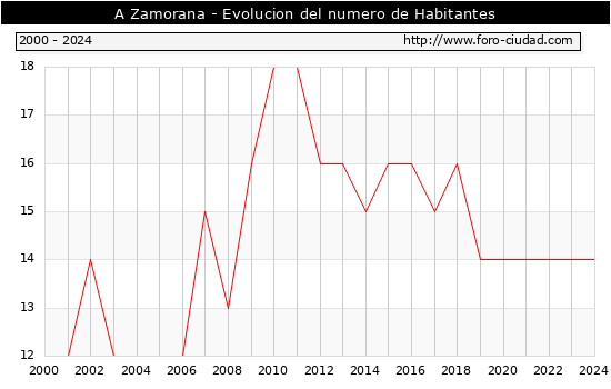 el numero de habitantes en A Zamorana era de 14, igual numero de habitantes que el en el año 2023. En el grafico siguiente se puede ver cuantos habitantes tiene A Zamorana a lo largo de los años.