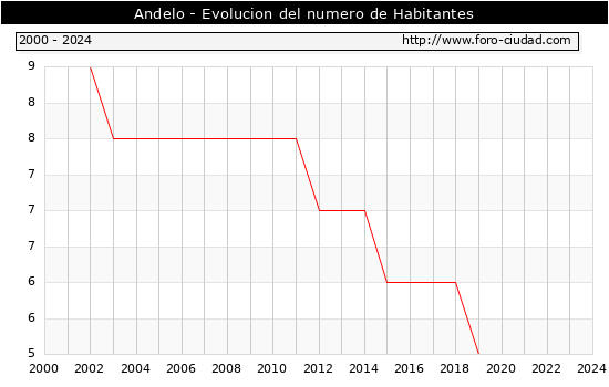 el numero de habitantes en Andelo era de 5, igual numero de habitantes que el en el año 2023. En el grafico siguiente se puede ver cuantos habitantes tiene Andelo a lo largo de los años.