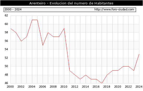 el numero de habitantes en Arenteiro era de 53, 4 habitantes mas que el en el año 2023. En el grafico siguiente se puede ver cuantos habitantes tiene Arenteiro a lo largo de los años.