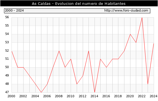 el numero de habitantes en As Caldas era de 53, 5 habitantes mas que el en el año 2023. En el grafico siguiente se puede ver cuantos habitantes tiene As Caldas a lo largo de los años.