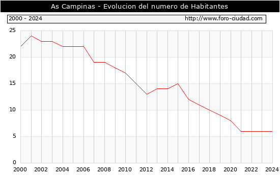 el numero de habitantes en As Campinas era de 6, igual numero de habitantes que el en el año 2023. En el grafico siguiente se puede ver cuantos habitantes tiene As Campinas a lo largo de los años.