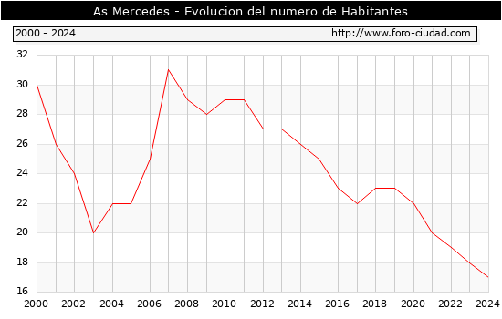 el numero de habitantes en As Mercedes era de 17, 1 habitantes menos que el en el año 2023. En el grafico siguiente se puede ver cuantos habitantes tiene As Mercedes a lo largo de los años.