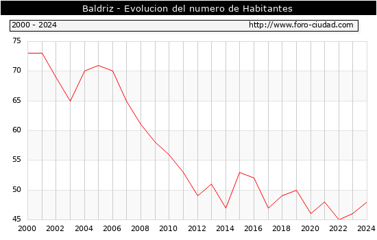 el numero de habitantes en Baldriz era de 48, 2 habitantes mas que el en el año 2023. En el grafico siguiente se puede ver cuantos habitantes tiene Baldriz a lo largo de los años.