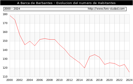 el numero de habitantes en A Barca de Barbantes era de 115, 9 habitantes menos que el en el año 2023. En el grafico siguiente se puede ver cuantos habitantes tiene A Barca de Barbantes a lo largo de los años.