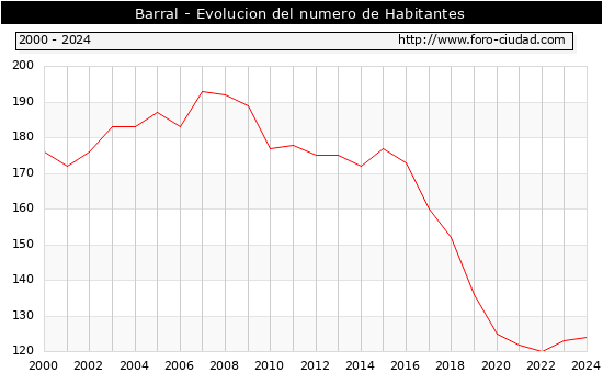 el numero de habitantes en Barral era de 124, 1 habitantes mas que el en el año 2023. En el grafico siguiente se puede ver cuantos habitantes tiene Barral a lo largo de los años.