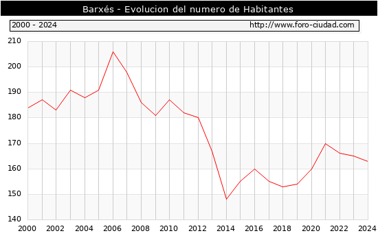 el numero de habitantes en Barxés era de 163, 2 habitantes menos que el en el año 2023. En el grafico siguiente se puede ver cuantos habitantes tiene Barxés a lo largo de los años.