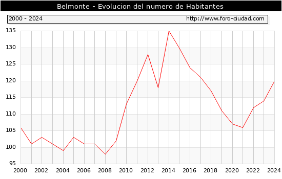 el numero de habitantes en Belmonte era de 120, 6 habitantes mas que el en el año 2023. En el grafico siguiente se puede ver cuantos habitantes tiene Belmonte a lo largo de los años.