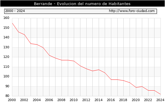 el numero de habitantes en Berrande era de 82, 4 habitantes menos que el en el año 2023. En el grafico siguiente se puede ver cuantos habitantes tiene Berrande a lo largo de los años.