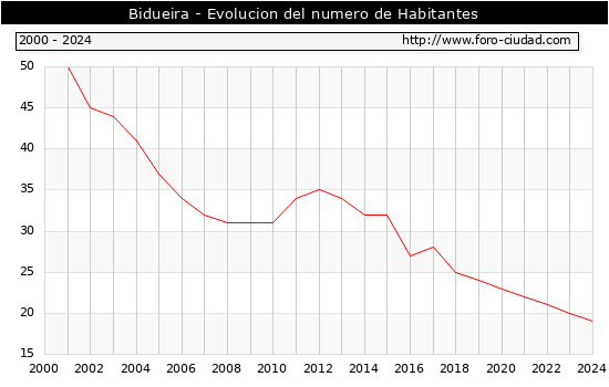 el numero de habitantes en Bidueira era de 19, 1 habitantes menos que el en el año 2023. En el grafico siguiente se puede ver cuantos habitantes tiene Bidueira a lo largo de los años.