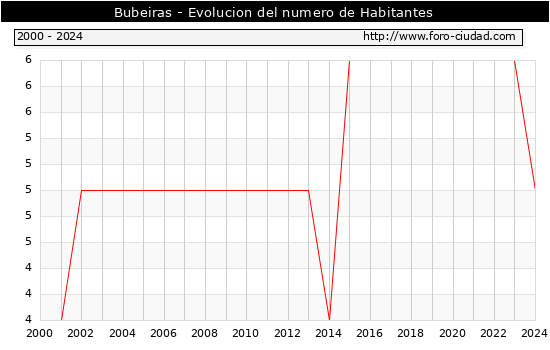 el numero de habitantes en Bubeiras era de 5, 1 habitantes menos que el en el año 2023. En el grafico siguiente se puede ver cuantos habitantes tiene Bubeiras a lo largo de los años.