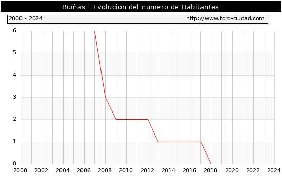 el numero de habitantes en Buíñas era de 0, igual numero de habitantes que el en el año 2023. En el grafico siguiente se puede ver cuantos habitantes tiene Buíñas a lo largo de los años.