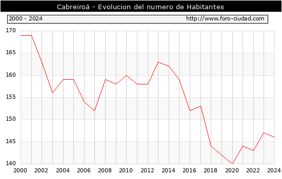 el numero de habitantes en Cabreiroá era de 146, 1 habitantes menos que el en el año 2023. En el grafico siguiente se puede ver cuantos habitantes tiene Cabreiroá a lo largo de los años.